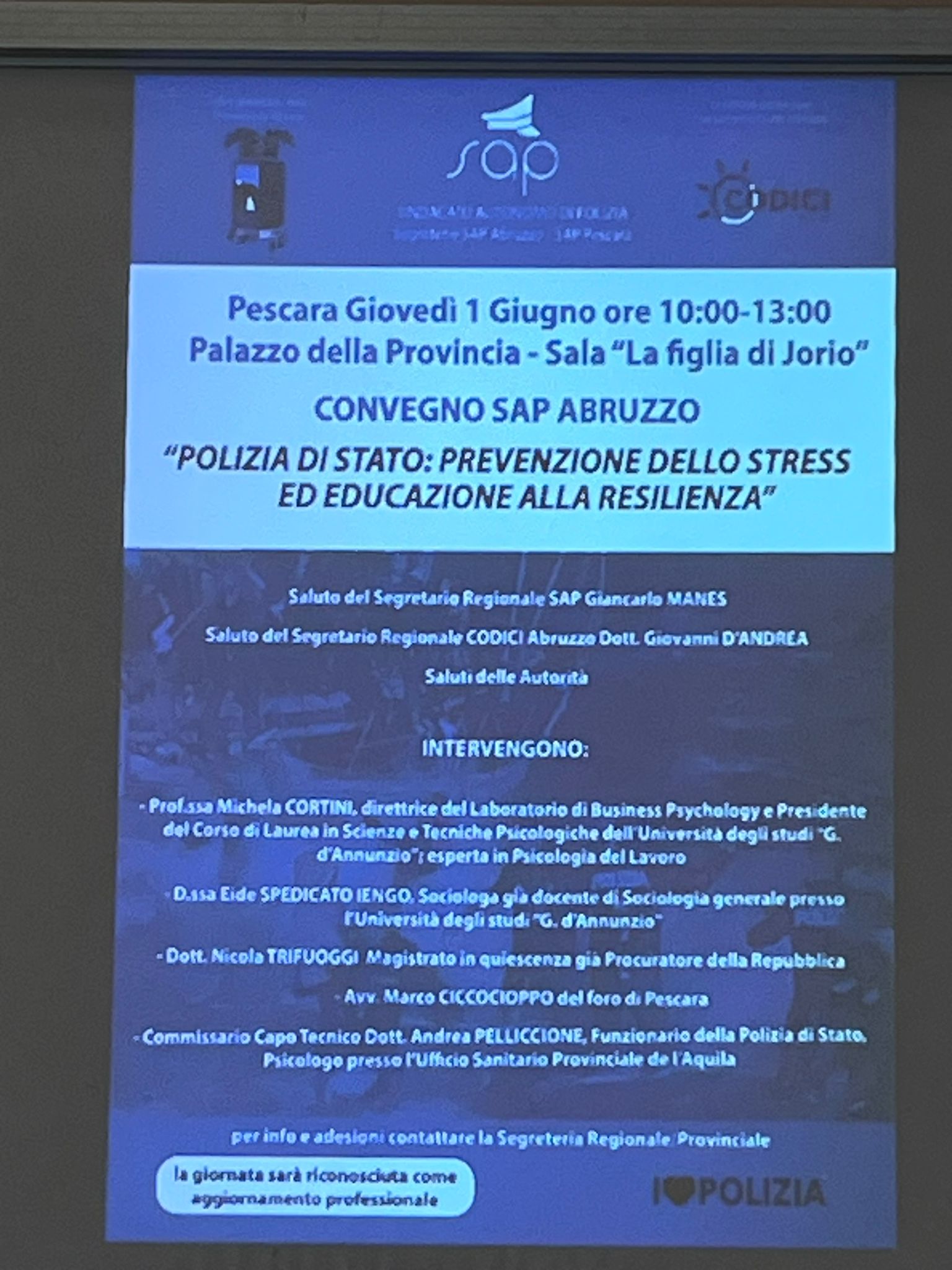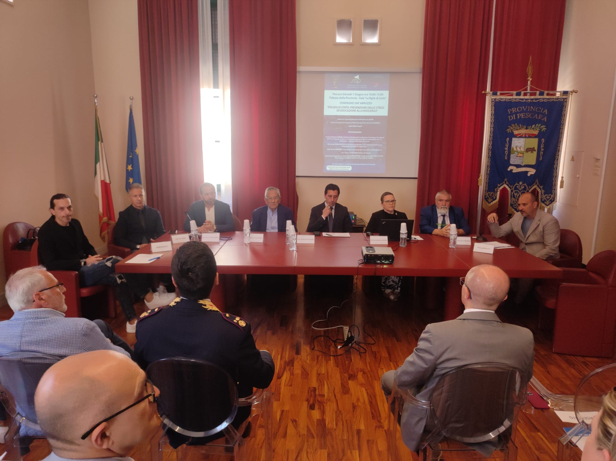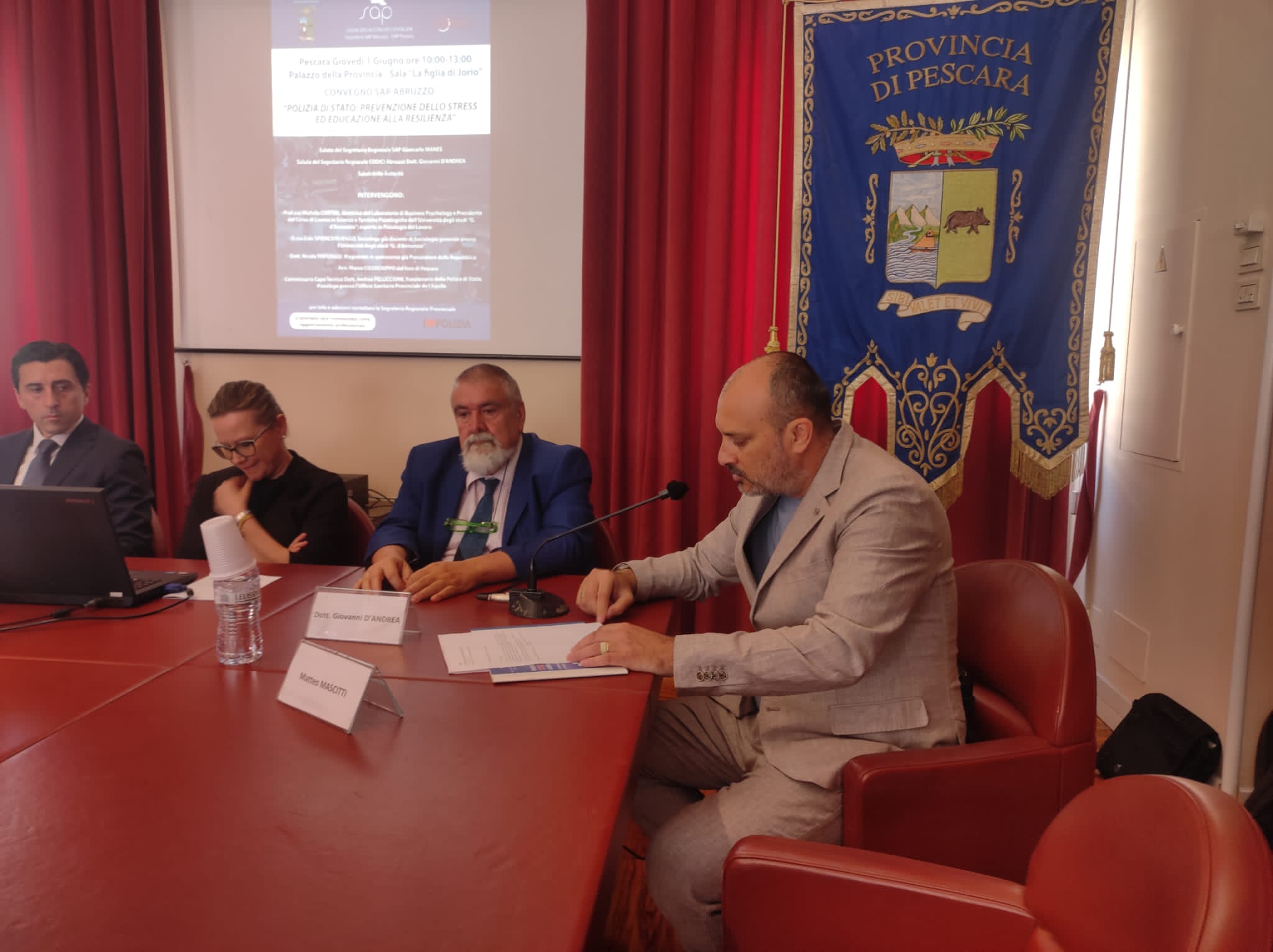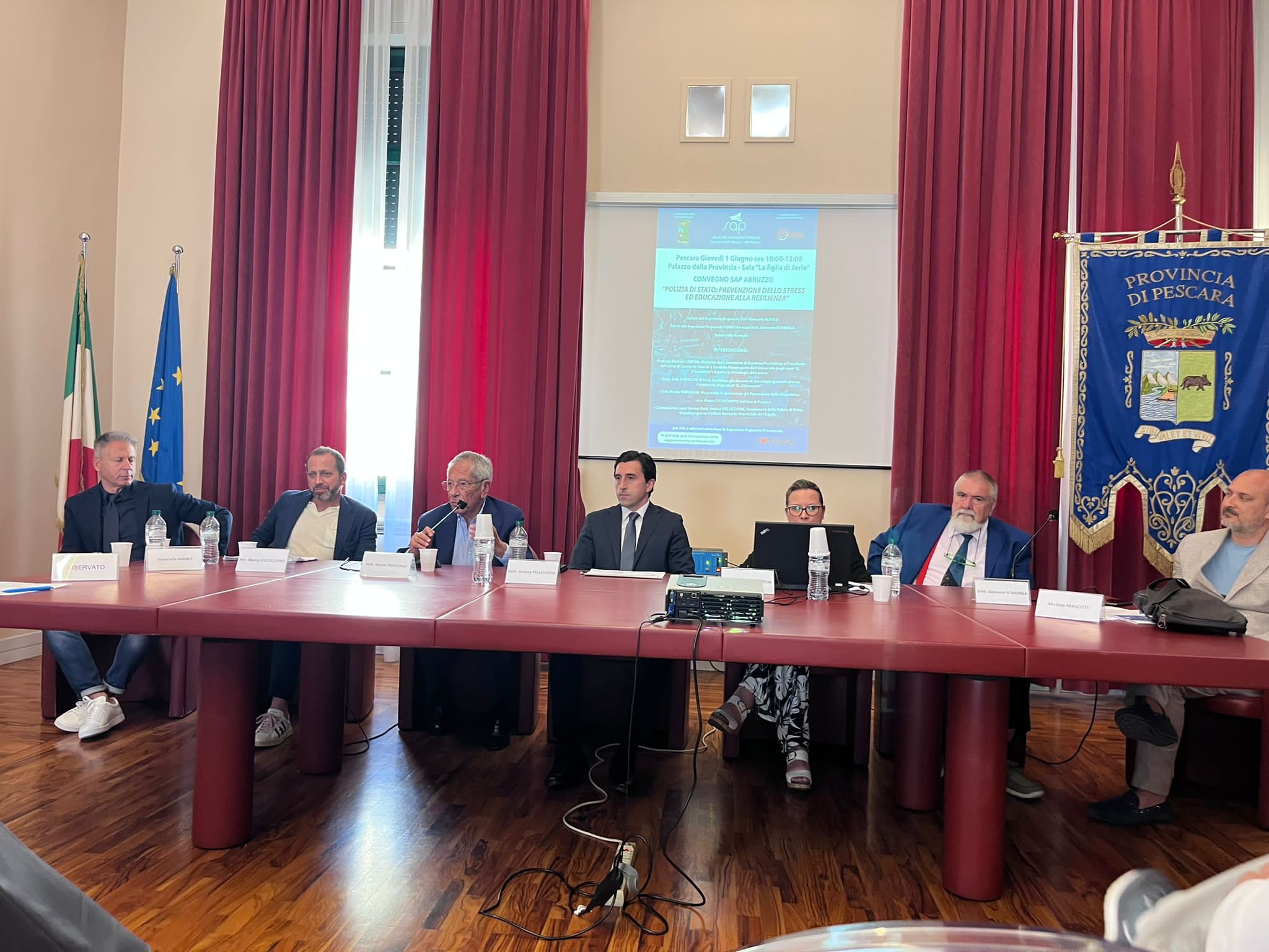 Nella mattinata di ieri, 1° giugno, la prestigiosa sala “La figlia di Iorio” del Palazzo della provincia di Pescara, ha ospitato il convegno, organizzato dalla Segreteria Regionale SAP Abruzzo e dalla Segreteria Provinciale SAP di Pescara, dal tema “Polizia di Stato: prevenzione dello stress ed educazione alla resilienza” con il patrocinio della Provincia di Pescara.