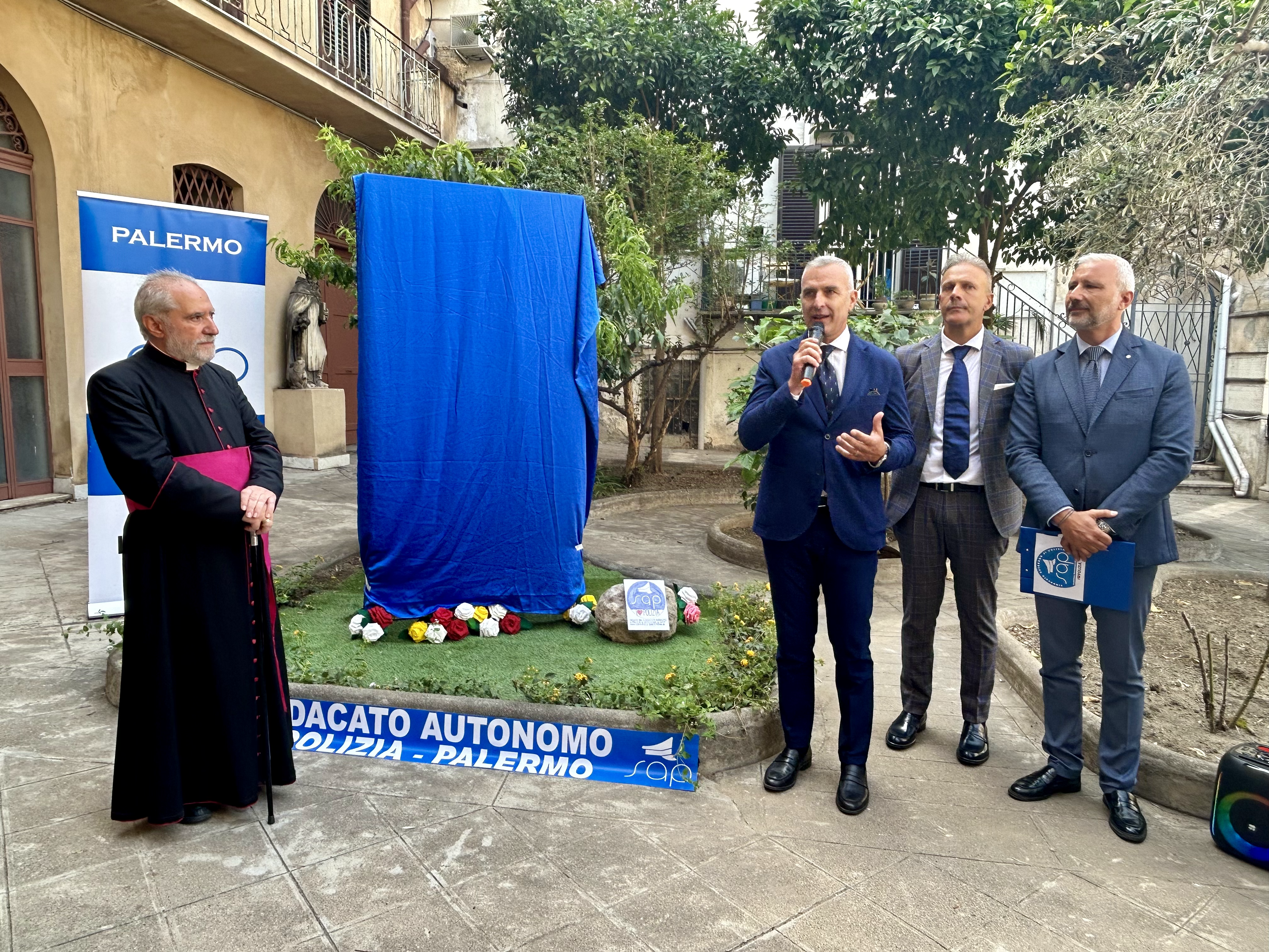 L’opera, è stata collocata, durante la cerimonia di questa mattina, nel giardino antistante la chiesa parrocchiale di Sant’Antonio Abate alla presenza del Segretario Generale aggiunto del SAP Giuseppe Coco, del Segretario Provinciale del SAP di Palermo Danilo Geraci e delle autorità civili, militari e religiose.