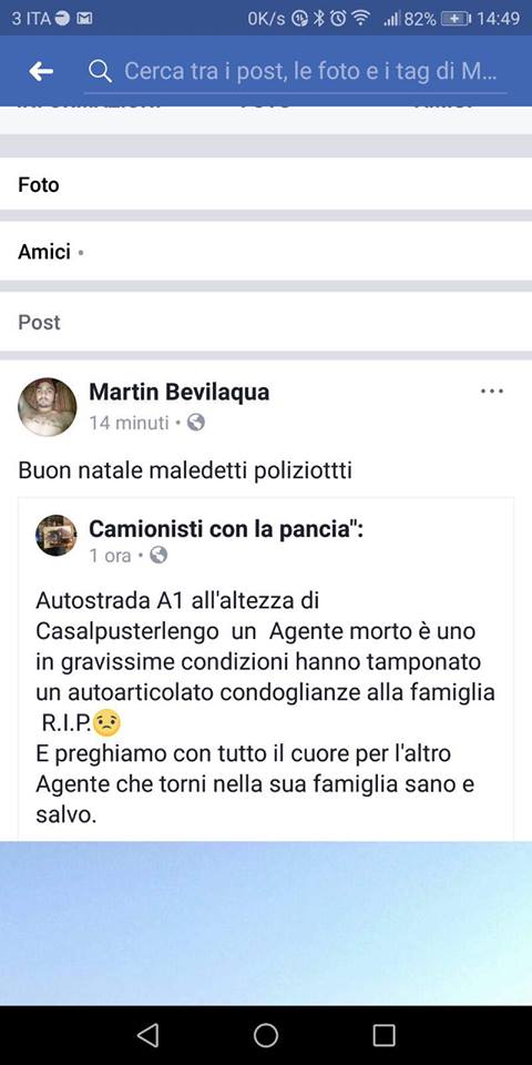 L’ennesima “capra” incivile, ha pensato bene di pubblicare su Facebook la foto dell’auto distrutta, a bordo della quale un nostro collega, Giuseppe Beolchi, ieri ha perso la vita. Il tale “Martin Bevilaqua”, ha scritto a corredo della foto “Buon Natale maledetti poliziotti”. Lo abbiamo denunciato e auspichiamo in una pena esemplare.