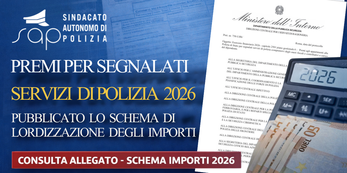 PREMI PER SEGNALATI SERVIZI DI POLIZIA ANNO 2026, PUBBLICATO LO SCHEMA DI LORDIZZAZIONE DEGLI IMPORTI