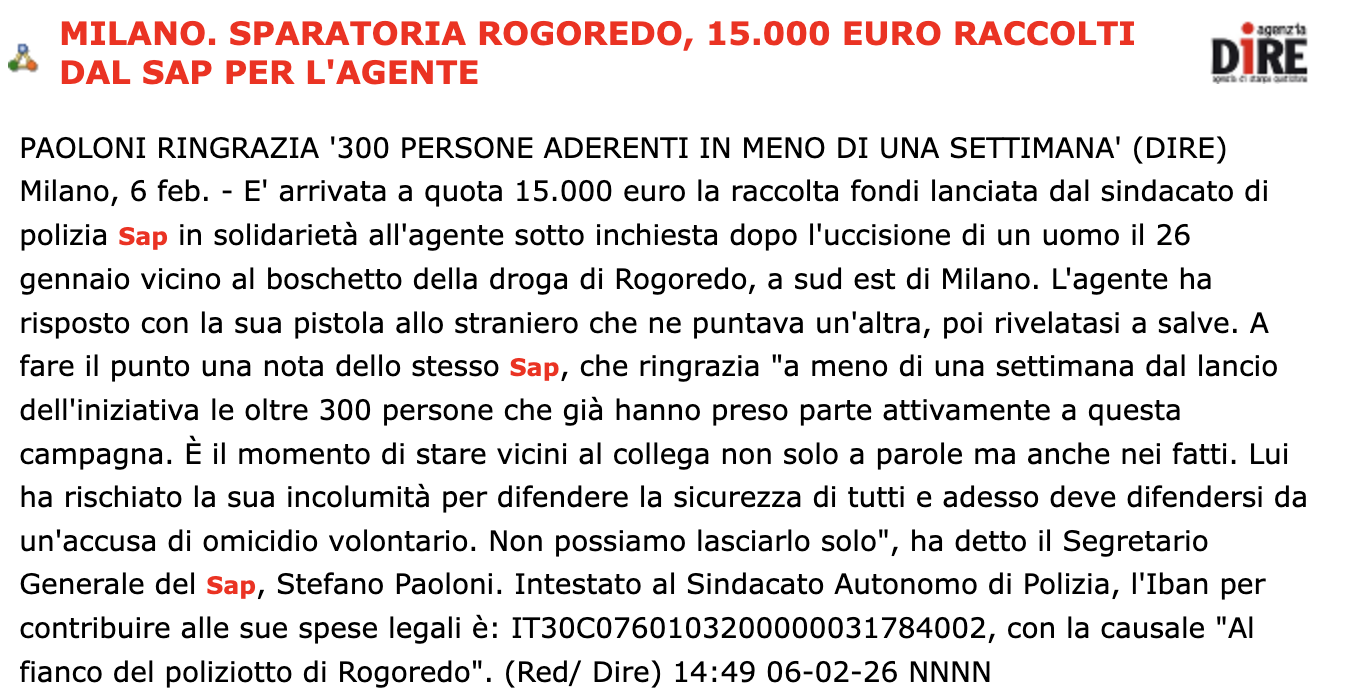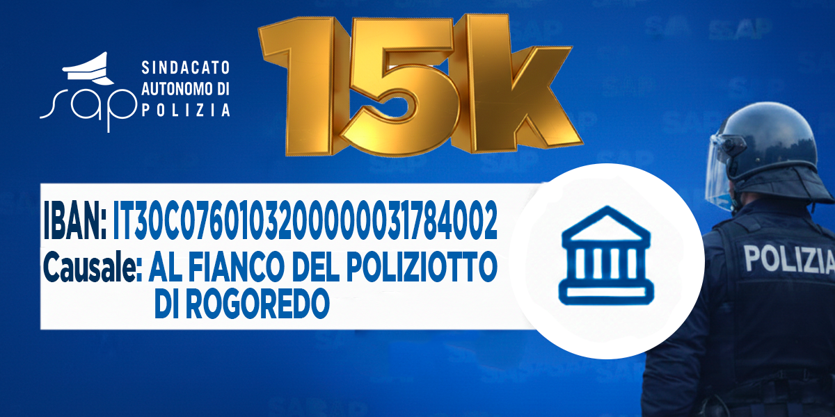 Intestato al Sindacato Autonomo di Polizia, l’Iban per contribuire alle sue spese legali è: IT30C0760103200000031784002, con la causale AL FIANCO DEL POLIZIOTTO DI ROGOREDO.