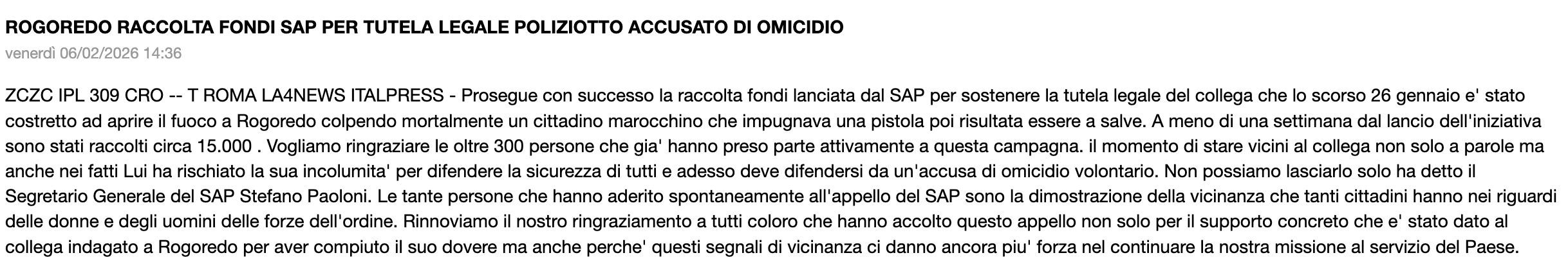 A meno di una settimana dal suo lancio, ha già raggiunto quota 15.000€ la raccolta fondi del SAP per sostenere la tutela legale del collega accusato di omicidio volontario dopo che, lo scorso 26 gennaio, è stato costretto ad aprire il fuoco a Rogoredo. “Vogliamo ringraziare le oltre 300 persone che già hanno preso parte attivamente a questo appello”, ha detto il Segretario Generale del SAP, Stefano Paoloni, ricordando che “questi segnali di vicinanza ci danno ancora più forza nel continuare la nostra missione al servizio del Paese”.