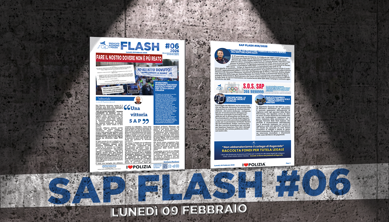 SAP FLASH NR. 06-2026 – FARE IL NOSTRO DOVERE NON È PIÙ REATO Redazione - News - 6 Febbraio 2026 Redazione 3.870 views 10 secs 0 Comments È online il SAP FLASH nr. 06-2026 – FARE IL NOSTRO DOVERE NON È PIÙ REATO Per scaricarlo clicca sul link sottostante SAP FLASH #06 Visite: 303 PREVIOUS CONFERIMENTO PREMI DI STUDIO PER I FIGLI E PER GLI ORFANI DEI DIPENDENTI DELLA POLIZIA DI STATO PER L’ANNO 2026
