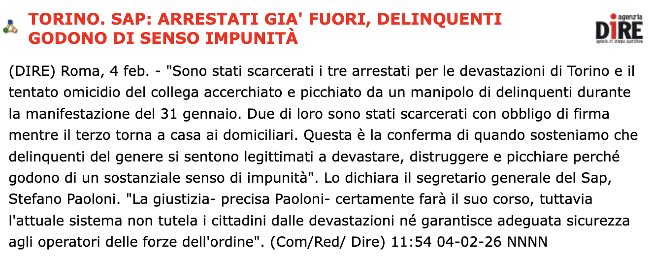 “Sono stati scarcerati i tre arrestati per le devastazioni di Torino e il tentato omicidio del collega accerchiato e picchiato da un manipolo di delinquenti durante la manifestazione del 31 gennaio. Due di loro sono stati scarcerati con obbligo di firma mentre il terzo torna a casa ai domiciliari. Questa è la conferma di quando sosteniamo che delinquenti del genere si sentono legittimati a devastare, distruggere e picchiare perché godono di un sostanziale senso di impunità”. Lo dichiara il Segretario Generale del SAP, Stefano Paoloni. “La giustizia – precisa – certamente farà il suo corso, tuttavia l’attuale sistema non tutela i cittadini dalle devastazioni né garantisce adeguata sicurezza agli operatori delle forze dell’ordine”.