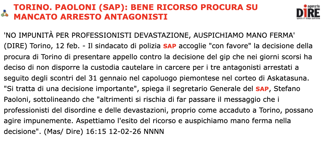 Il SAP accoglie con favore la decisione della procura di Torino di presentare appello contro la decisione del gip che nei giorni scorsi ha deciso di non disporre la custodia cautelare in carcere per i tre antagonisti arrestati a seguito degli scontri del 31 gennaio nel capoluogo piemontese. “Si tratta di una decisione importante”, spiega il Segretario Generale del SAP, Stefano Paoloni, sottolineando che “altrimenti si rischia di far passare il messaggio che i professionisti del disordine e delle devastazioni, proprio come accaduto a Torino, possano agire impunemente. Aspettiamo l’esito del ricorso e auspichiamo mano ferma nella decisione”.