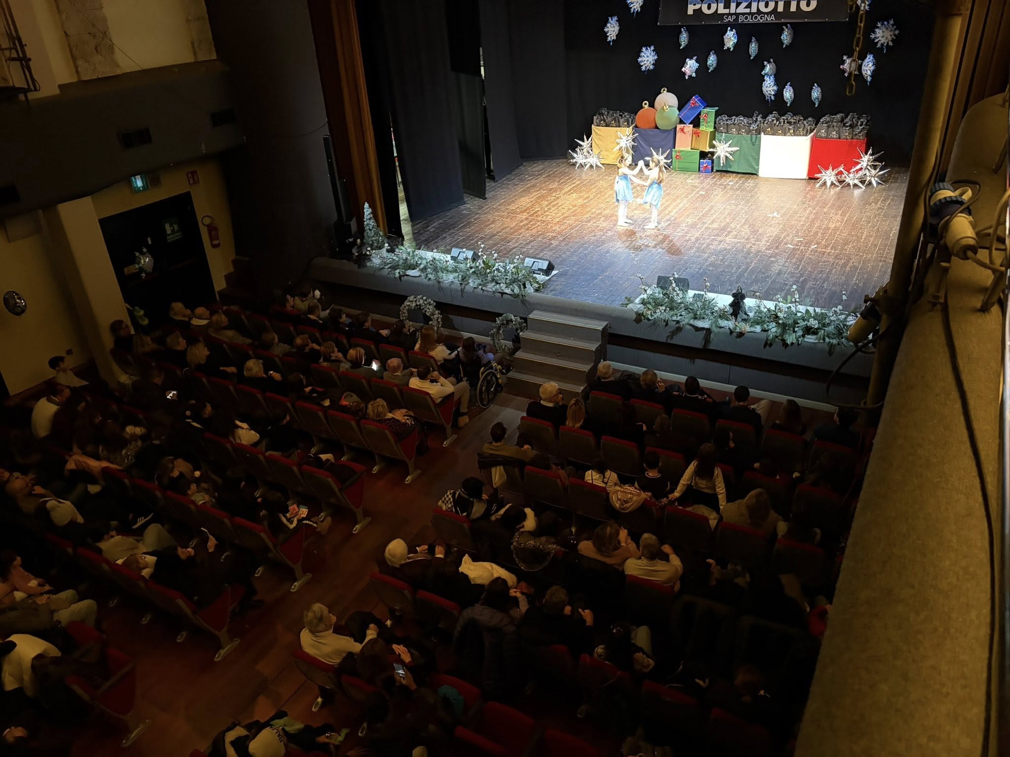Sul palco, del teatro di Casalecchio, anche Alessia Mertz e Fabio Bazzani, oltre alla Befana, che ha preferito la Tesla della Polizia di Stato alla consueta scopa, come veicolo per raggiungere il teatro e distribuire dolci al pubblico presente.
