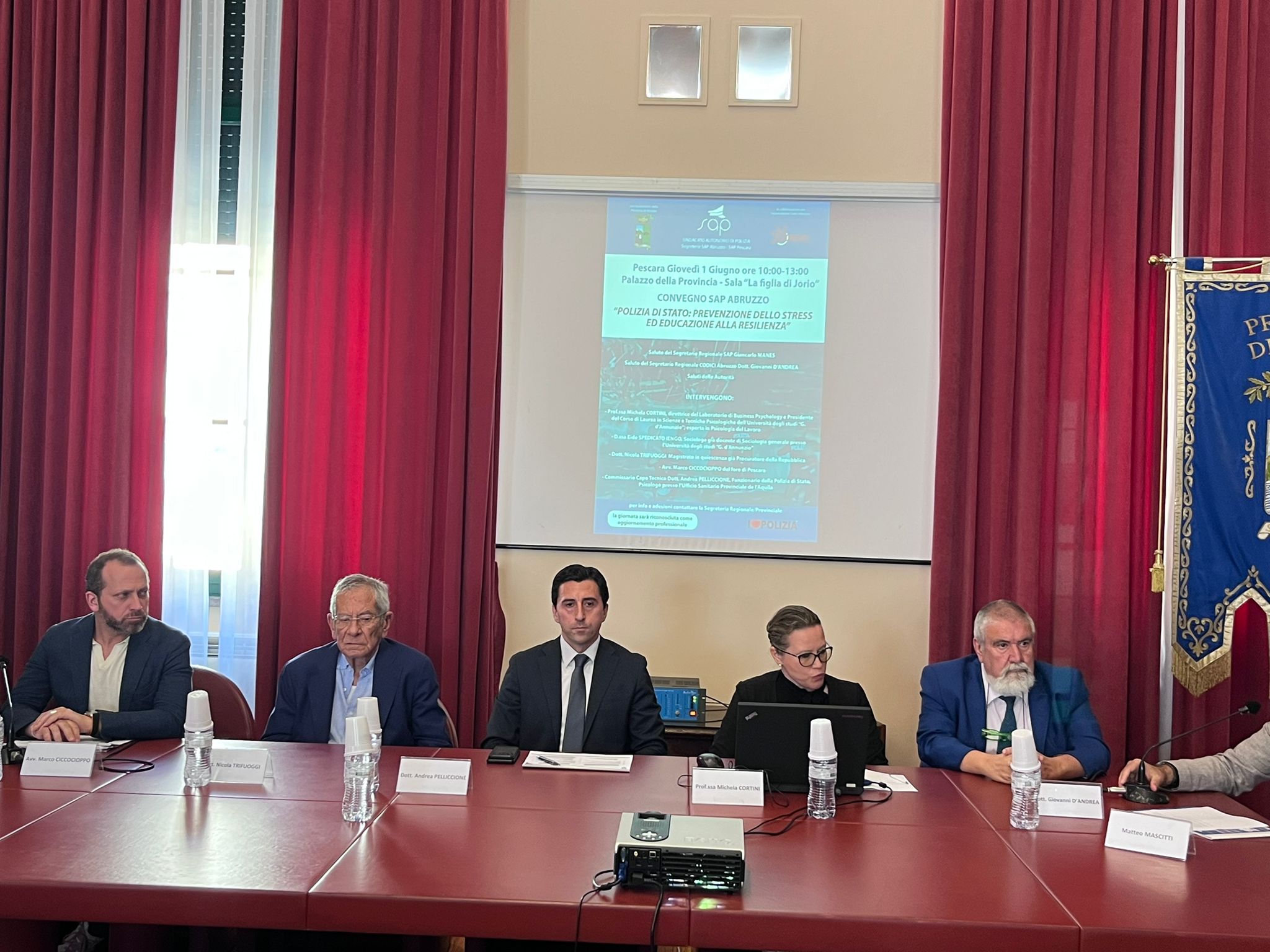 Nella mattinata di ieri, 1° giugno, la prestigiosa sala “La figlia di Iorio” del Palazzo della provincia di Pescara, ha ospitato il convegno, organizzato dalla Segreteria Regionale SAP Abruzzo e dalla Segreteria Provinciale SAP di Pescara, dal tema “Polizia di Stato: prevenzione dello stress ed educazione alla resilienza” con il patrocinio della Provincia di Pescara.