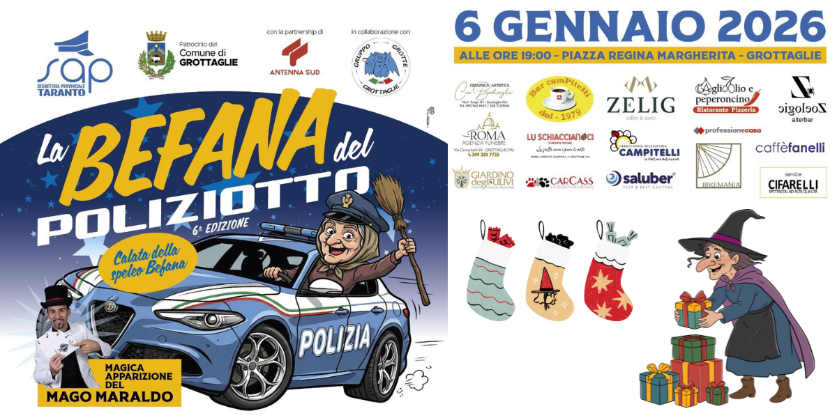 Torna anche nel 2026 uno degli appuntamenti più attesi organizzati dal Sap di Taranto. Il 6 gennaio, alle ore 19.00 in piazza Regina Margherita, si svolgerà la VI edizione de “La Befana del Poliziotto”, manifestazione organizzata dalla Segreteria provinciale del SAP di Taranto guidata da Fabrizio Santoro, in collaborazione con il “Gruppo Grotte Grottaglie“. L’iniziativa, è finalizzata a rafforzare il legame tra gli appartenenti alla Polizia di Stato e la cittadinanza, con particolare attenzione ai bambini e alle famiglie. Cuore dell’evento sarà la suggestiva “Calata della Speleo Befana”, affiancata dallo spettacolo di magia del Mago Maraldo, momenti di animazione e dalla distribuzione di giocattoli e gadget richiamanti i simboli della Polizia di Stato. La manifestazione, a carattere provinciale, vedrà la partecipazione di autorità civili e religiose, associazioni impegnate nel sociale, imprenditori locali e bambini con disabilità, in un contesto inclusivo e aperto alla cittadinanza. La scelta della piazza consentirà ai più piccoli di muoversi liberamente e partecipare attivamente alle attività, rendendo l’evento un autentico spot per la legalità e per i valori della Polizia di Stato, riassunti nello slogan che accompagna ogni edizione: I LOVE POLIZIA.