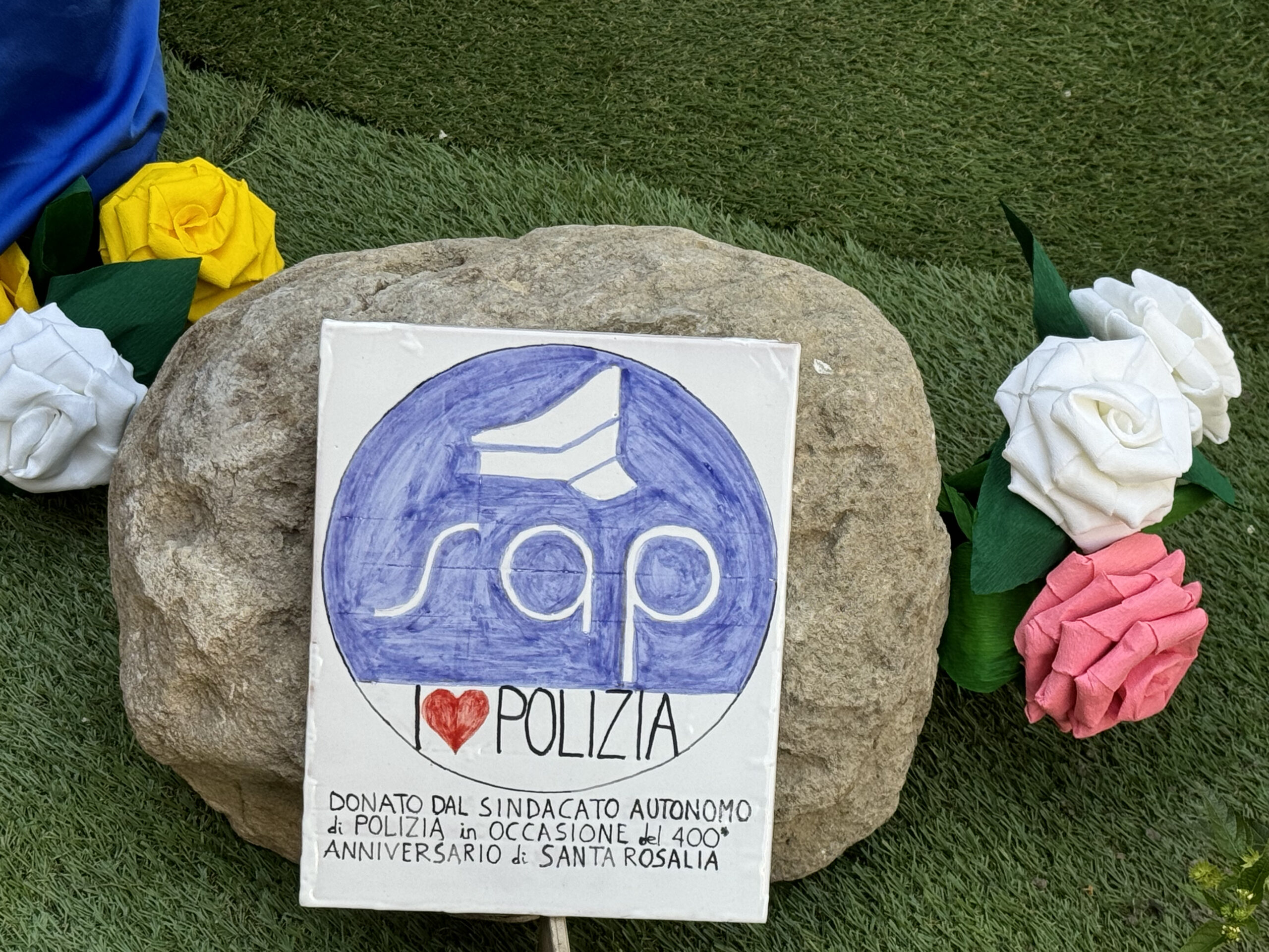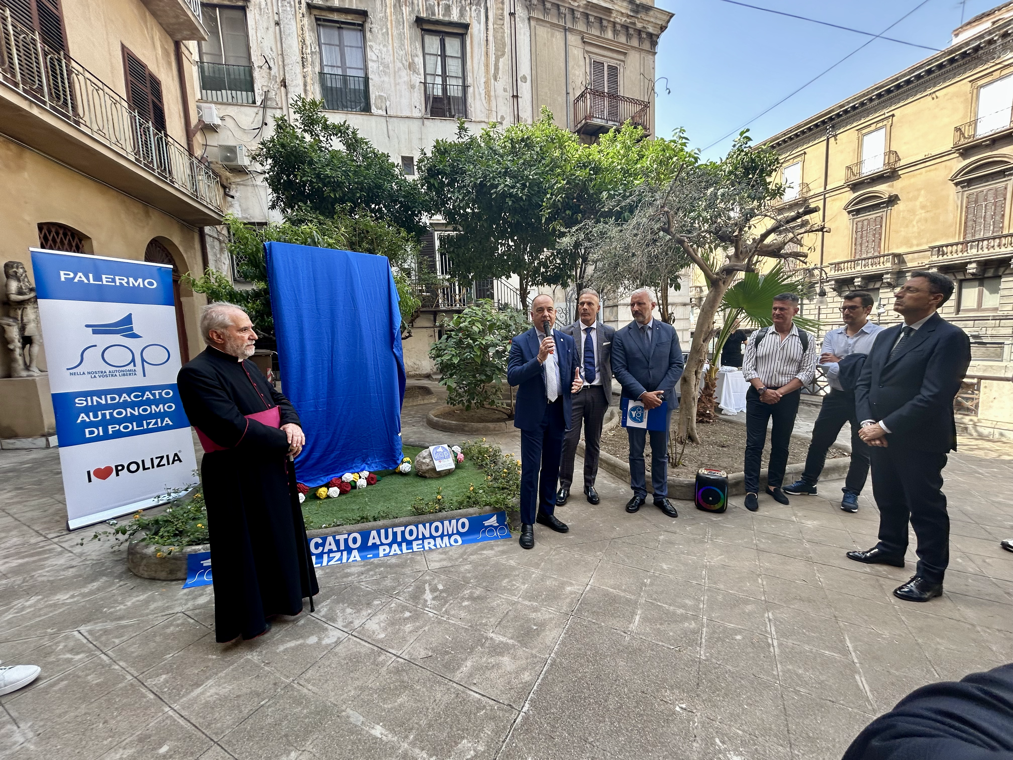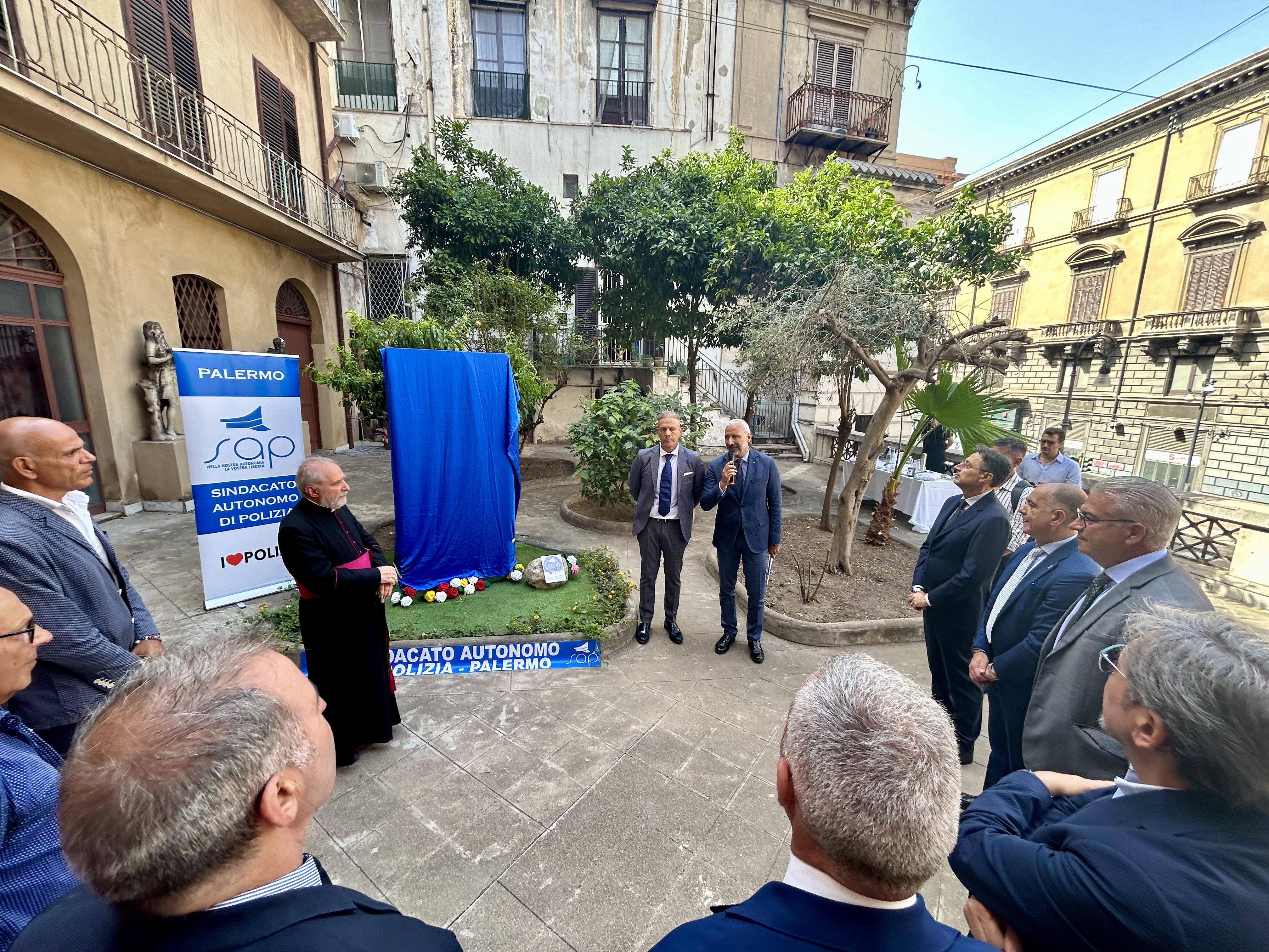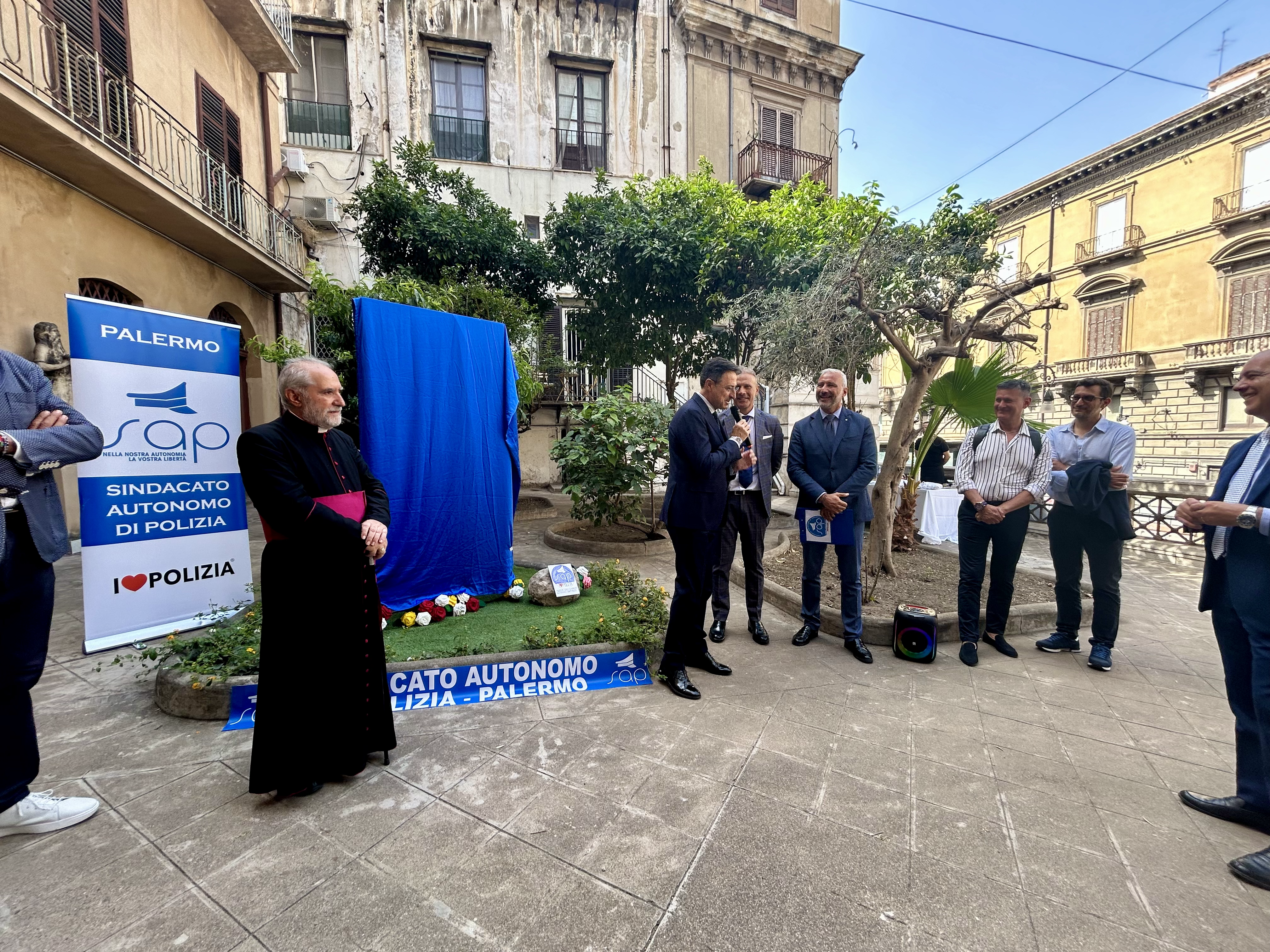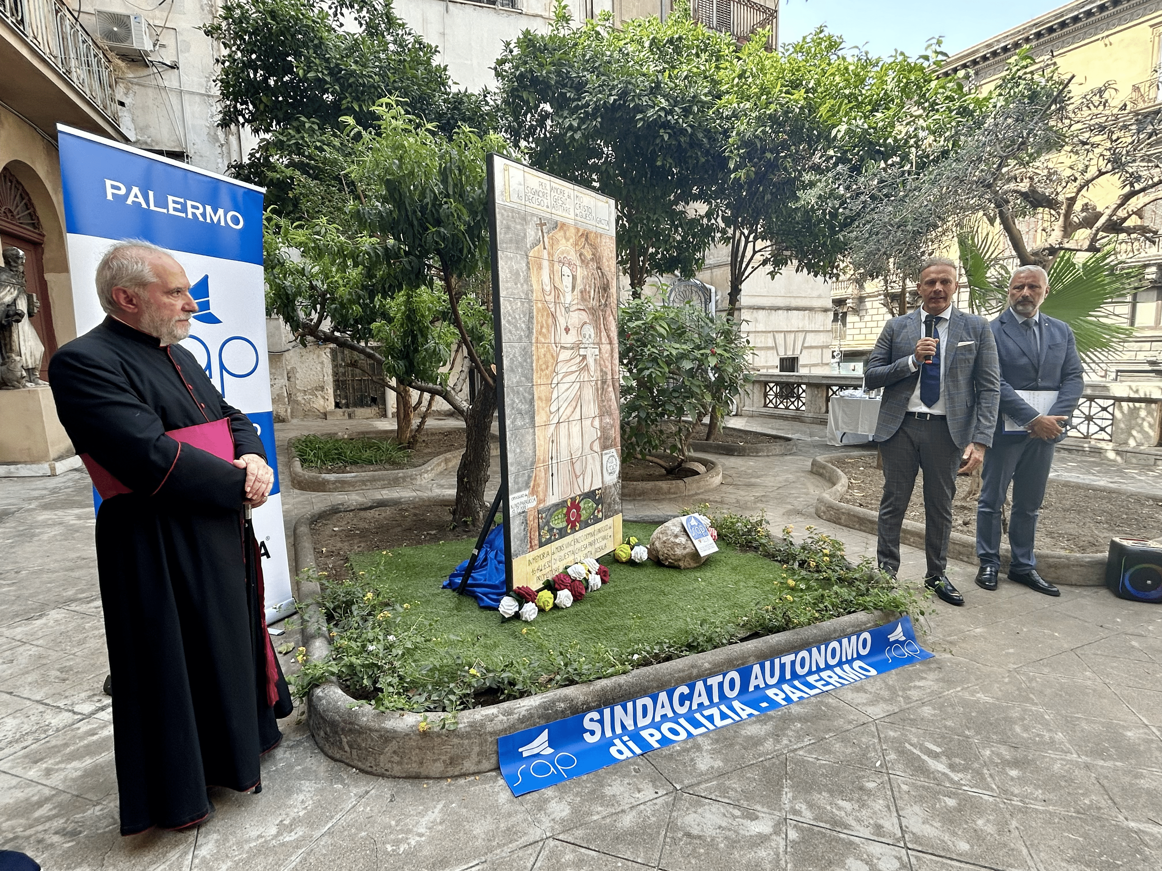 L’opera, è stata collocata, durante la cerimonia di questa mattina, nel giardino antistante la chiesa parrocchiale di Sant’Antonio Abate alla presenza del Segretario Generale aggiunto del SAP Giuseppe Coco, del Segretario Provinciale del SAP di Palermo Danilo Geraci e delle autorità civili, militari e religiose.