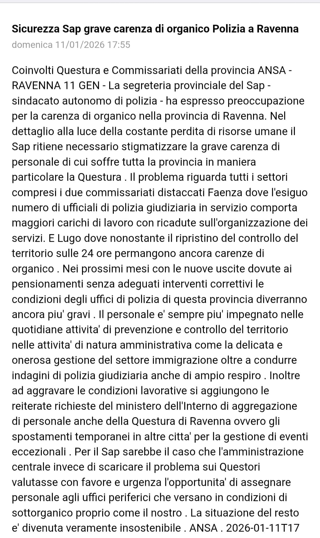 La Segreteria provinciale del SAP di Ravenna, guidata da Valter Rivola, segnala una situazione che «permane grave» per la «grave carenza di personale» che colpisce tutta la provincia, in particolare la Questura.