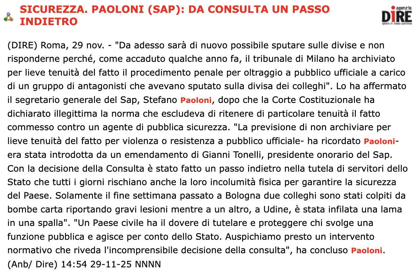 “Da adesso sarà di nuovo possibile sputare sulle divise e non risponderne perché, come accaduto qualche anno fa, il tribunale di Milano ha archiviato per lieve tenuità del fatto il procedimento penale per oltraggio a pubblico ufficiale a carico di un gruppo di antagonisti che avevano sputato sulla divisa dei colleghi”. Lo ha affermato il Segretario Generale del SAP, Stefano Paoloni, dopo che la Corte Costituzionale ha dichiarato illegittima la norma che escludeva di ritenere di particolare tenuità il fatto commesso contro un agente di pubblica sicurezza. “La previsione di non archiviare per lieve tenuità del fatto per violenza o resistenza a pubblico ufficiale – ha ricordato – era stata introdotta da un emendamento di Gianni Tonelli, presidente onorario del SAP. Con la decisione della Consulta è stato fatto un passo indietro nella tutela di servitori dello Stato che tutti i giorni rischiano anche la loro incolumità fisica per garantire la sicurezza del Paese. Un Paese civile ha il dovere di tutelare e proteggere chi svolge una funzione pubblica e agisce per conto dello Stato. Auspichiamo presto un intervento normativo che riveda l’incomprensibile decisione della consulta”, ha concluso.