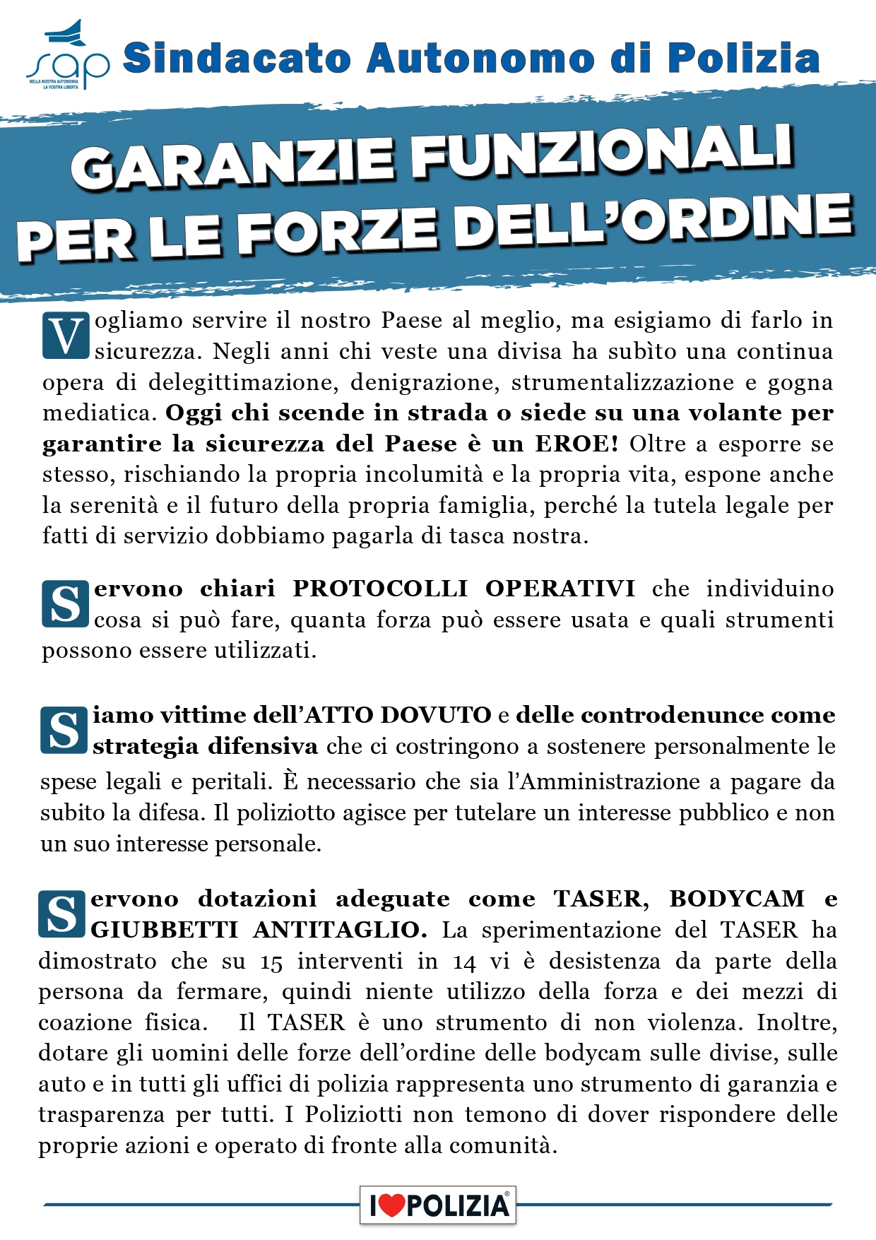 Le dotazioni di polizia devono costantemente essere adeguate alle nuove tecnologie e con strumenti utili per rendere sempre più sicuro ed efficace l’intervento di polizia. Si pensi ad esempio ai guanti antitaglio, ai corpetti protettivi, Bola Wrap, ecc. Inoltre, si devono poter avere strumenti idonei che consentano di utilizzare l’eventuale forza necessaria per vincere una resistenza o respingere una violenza in virtù del principio di proporzionalità. In proposito vanno introdotti strumenti tipo Taser o proiettili di gomma .