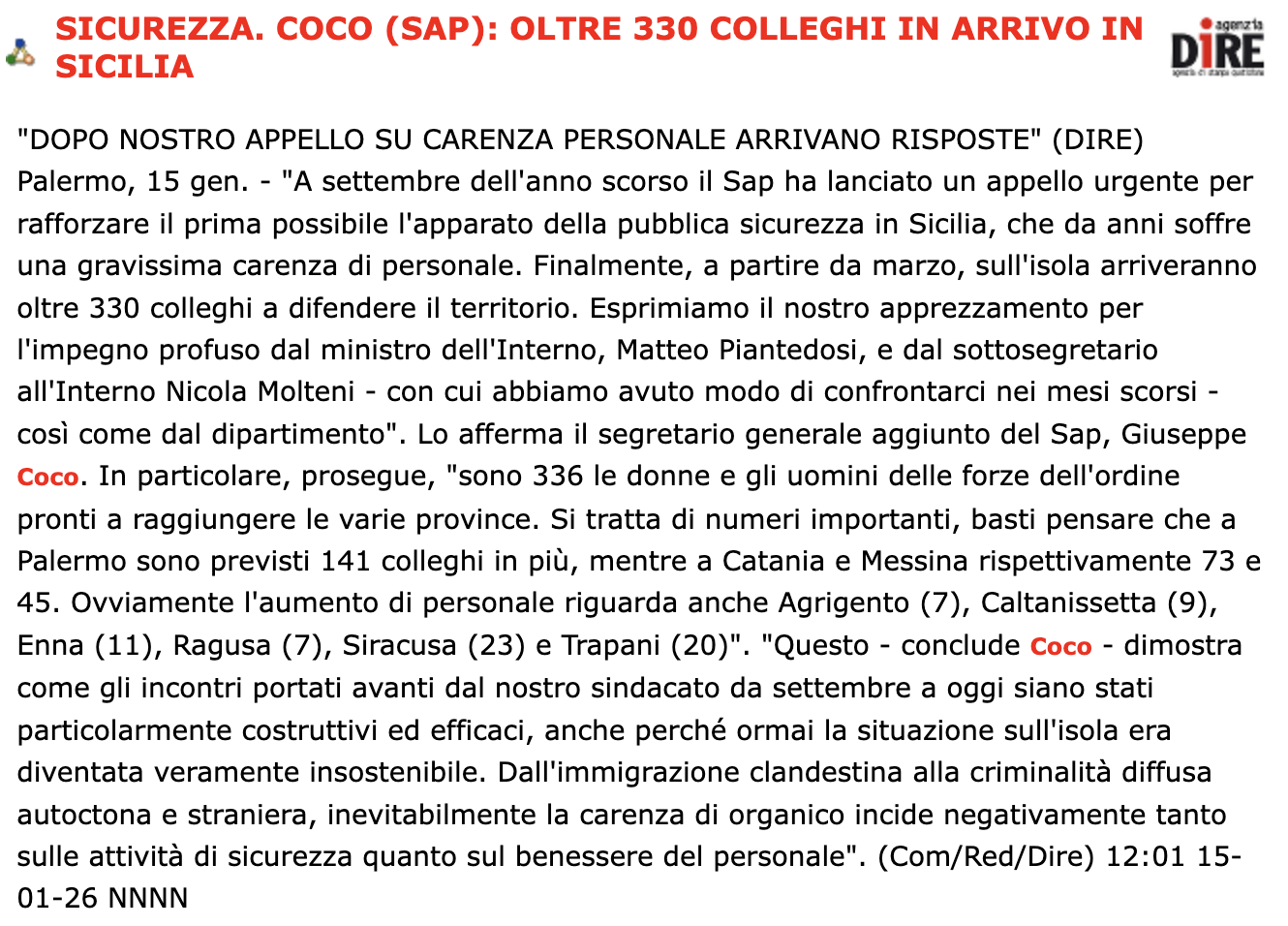 “A settembre dell’anno scorso il SAP ha lanciato un appello urgente per rafforzare il prima possibile l’apparato della pubblica sicurezza in Sicilia, che da anni soffre una gravissima carenza di personale. Finalmente, a partire da marzo, sull’isola arriveranno oltre 330 colleghi a difendere il territorio. Esprimiamo il nostro apprezzamento per l’impegno profuso dal Ministro dell’Interno, Matteo Piantedosi, e dal Sottosegretario all’Interno Nicola Molteni – con cui abbiamo avuto modo di confrontarci nei mesi scorsi – così come dal Dipartimento”. Lo ha affermato il Segretario Generale aggiunto del SAP, Giuseppe Coco. In particolare, ha proseguito, “sono 336 le donne e gli uomini delle forze dell’ordine pronti a raggiungere le varie province. Si tratta di numeri importanti, basti pensare che a Palermo sono previsti 141 colleghi in più, mentre a Catania e Messina rispettivamente 73 e 45. Ovviamente l’aumento di personale riguarda anche Agrigento (7), Caltanissetta (9), Enna (11), Ragusa (7), Siracusa (23) e Trapani (20)”.
