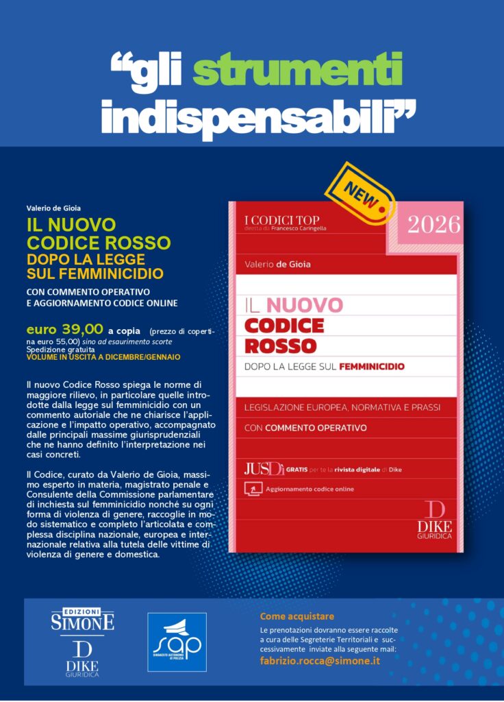 Il SAP informa gli iscritti che è disponibile, in convenzione, il nuovo volume Il Codice Rosso curato da Valerio De Gioia, magistrato penale e tra i massimi esperti nazionali in materia di violenza di genere.