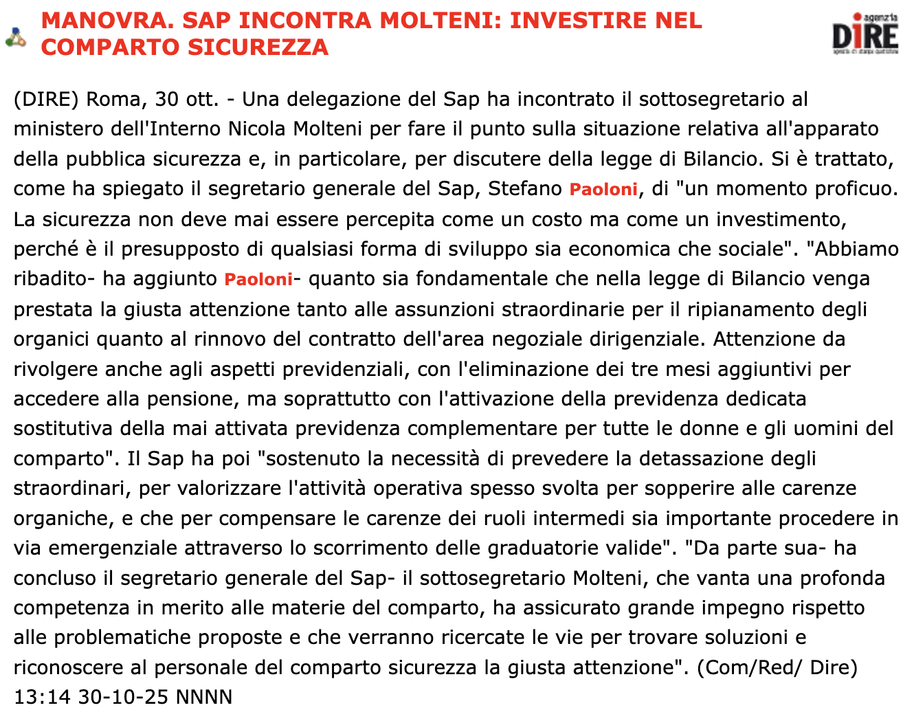 “Da parte sua, ha concluso il Segretario Generale del SAP, il Sottosegretario Molteni, che vanta una profonda competenza in merito alle materie del comparto, ha assicurato grande impegno rispetto alle problematiche proposte e che verranno ricercate le vie per trovare soluzioni e riconoscere al personale del comparto sicurezza la giusta attenzione”.