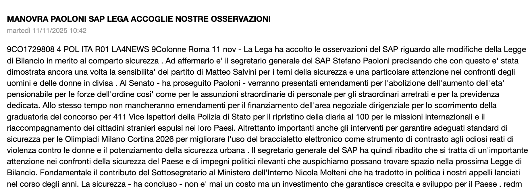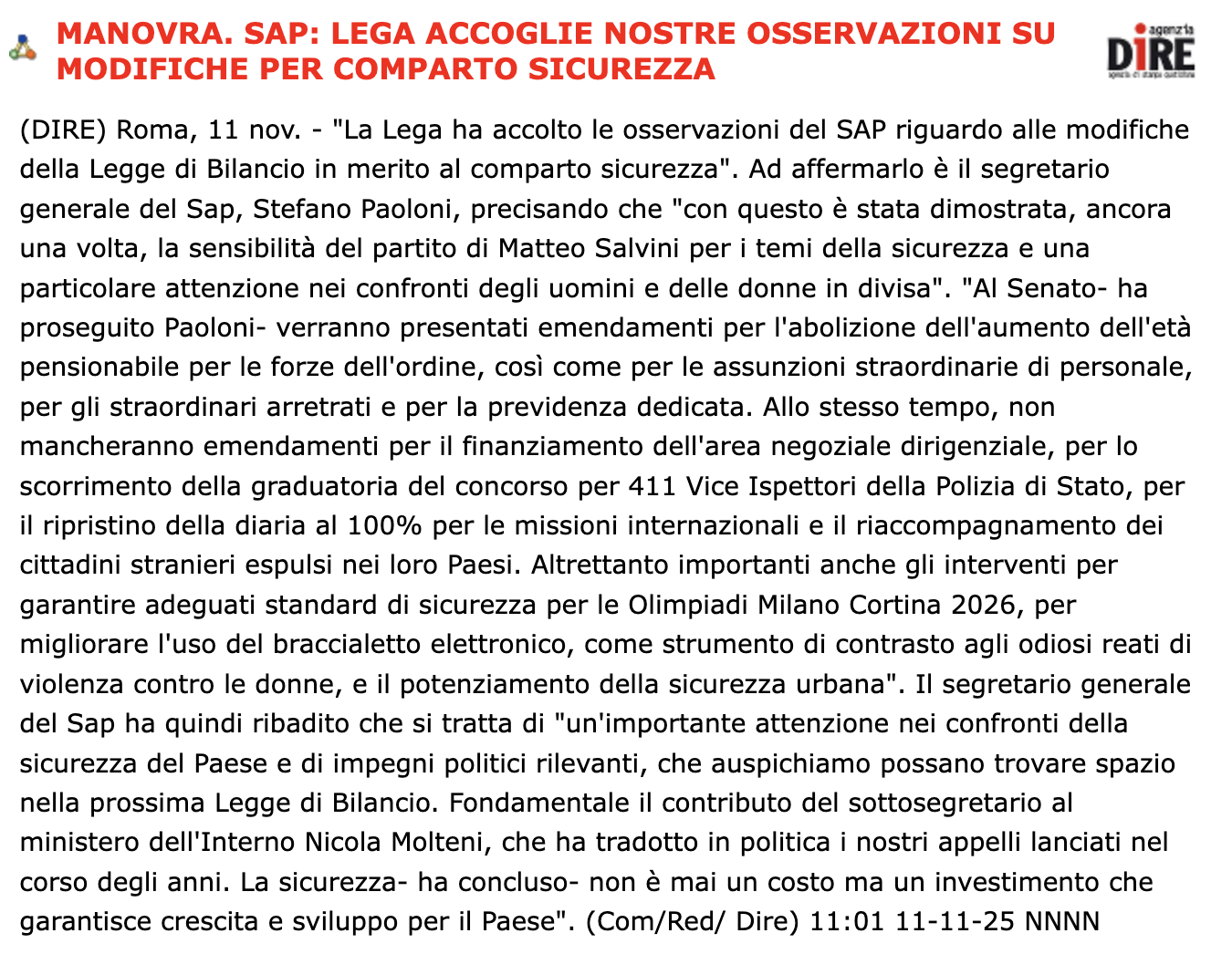 “La Lega ha accolto le osservazioni del SAP riguardo alle modifiche della Legge di Bilancio in merito al comparto sicurezza”. Ad affermarlo è il Segretario Generale del SAP, Stefano Paoloni, precisando che “con questo è stata dimostrata, ancora una volta, la sensibilità del partito di Matteo Salvini per i temi della sicurezza e una particolare attenzione nei confronti degli uomini e delle donne in divisa. Al Senato verranno presentati emendamenti per l’abolizione dell’aumento dell’età pensionabile per le forze dell’ordine, così come per le assunzioni straordinarie di personale, per gli straordinari arretrati e per la previdenza dedicata. Allo stesso tempo, non mancheranno emendamenti per il finanziamento dell’area negoziale dirigenziale, per lo scorrimento della graduatoria del concorso per 411 Vice Ispettori della Polizia di Stato, per il ripristino della diaria al 100% per le missioni internazionali e il riaccompagnamento dei cittadini stranieri espulsi nei loro Paesi. Altrettanto importanti anche gli interventi per garantire adeguati standard di sicurezza per le Olimpiadi Milano Cortina 2026, per migliorare l’uso del braccialetto elettronico, come strumento di contrasto agli odiosi reati di violenza contro le donne, e il potenziamento della sicurezza urbana”.