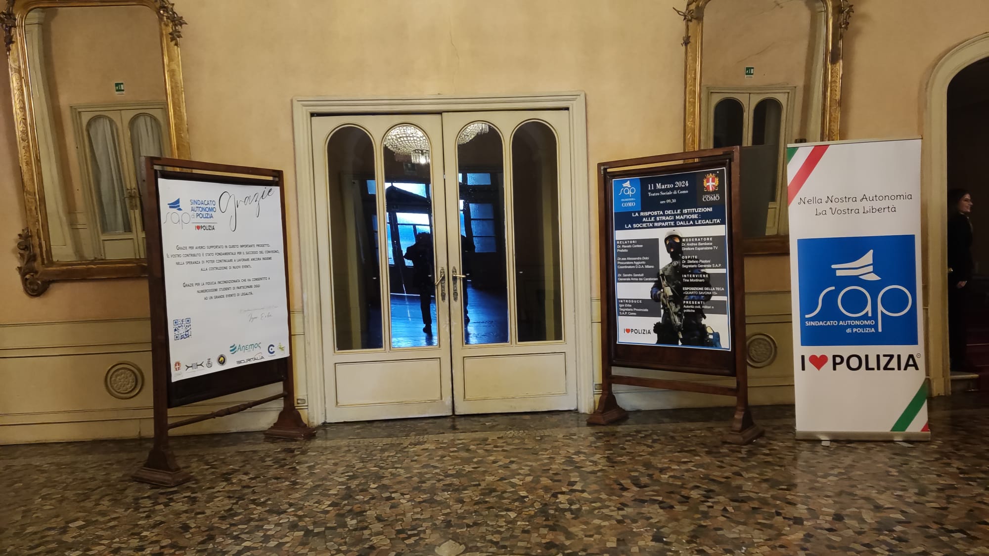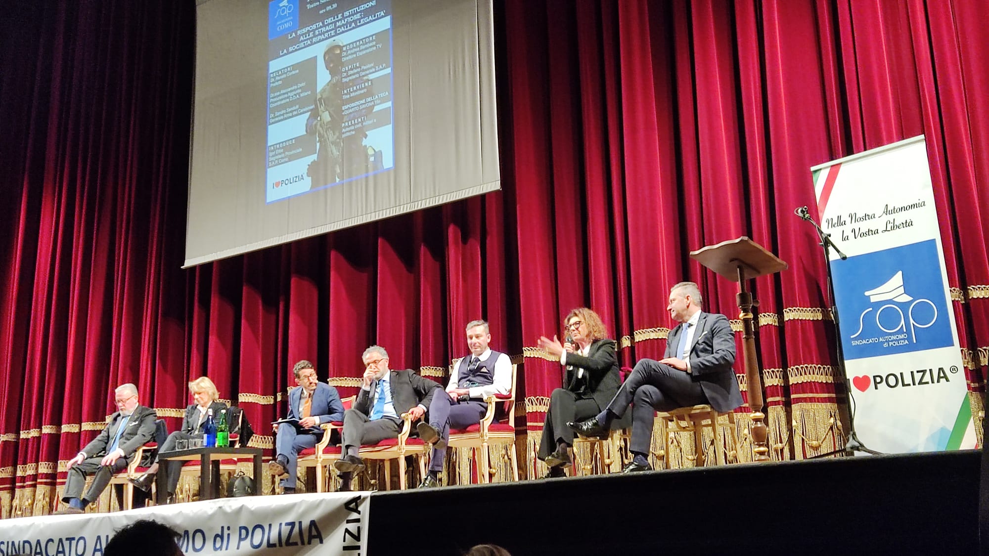 Grande successo per il convegno organizzato dalla Segreteria provinciale del SAP Como guidata dal Segretario Igor Erba. Nella giornata di ieri 11 marzo presso il Teatro sociale di Como si è svolto l’interessante convegno “LA RISPOSTA DELLE ISTITUZIONI ALLE STRAGI MAFIOSE: LA SOCIETÀ RIPARTE DALLA LEGALITÀ” a cui hanno preso parte relatori di rilevanza nazionale: il Prefetto Renato Cortese, il Procuratore aggiunto Coordinatore della DDA di Milano Alessandra Dolci e il Generale dell’Arma dei Carabinieri Sandro Sandulli. Intervenuta anche Tina Montinaro, vedova del collega Antonio Montinaro capo scorta del giudice Falcone caduto nell’attentato di Capaci del 23 maggio 1992, che ha svelato la teca presente all’esterno del teatro contenente i resti della “Quarto Savona 15”, la Fiat Croma fatta saltare in aria proprio nell’attentato di Capaci.