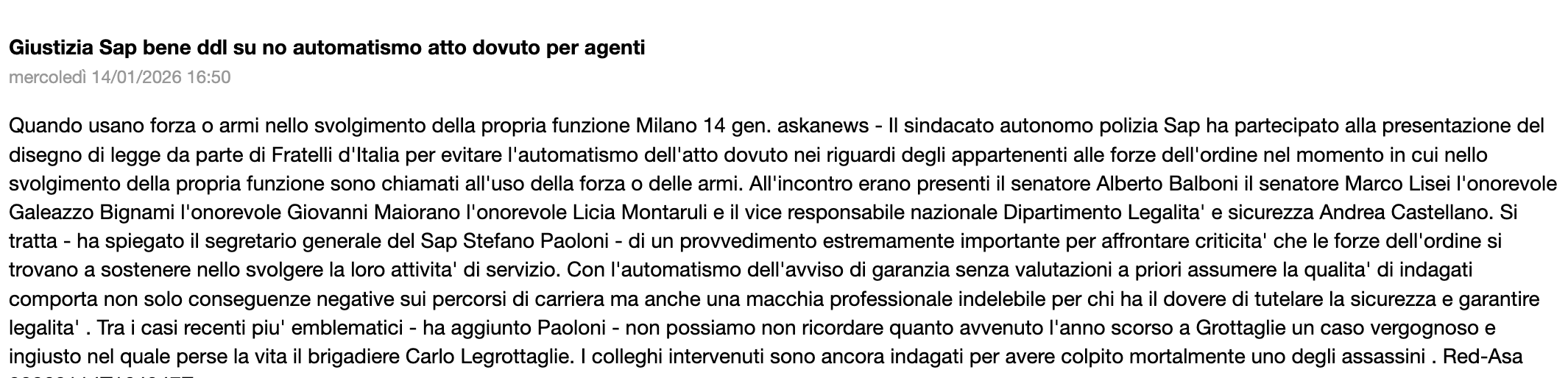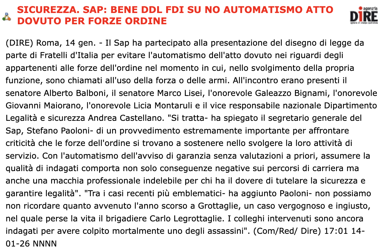 “Si tratta – ha spiegato il Segretario Generale del SAP, Stefano Paoloni – di un provvedimento estremamente importante per affrontare criticità che le forze dell’ordine si trovano a sostenere nello svolgere la loro attività di servizio. Con l’automatismo dell’avviso di garanzia senza valutazioni a priori, assumere la qualità di indagati comporta non solo conseguenze negative sui percorsi di carriera ma anche una macchia professionale indelebile per chi ha il dovere di tutelare la sicurezza e garantire legalità. Tra i casi recenti più emblematici – ha aggiunto – non possiamo non ricordare quanto avvenuto l’anno scorso a Grottaglie, un caso vergognoso e ingiusto, nel quale perse la vita il brigadiere Carlo Legrottaglie. I colleghi intervenuti sono ancora indagati per avere colpito mortalmente uno degli assassini”.