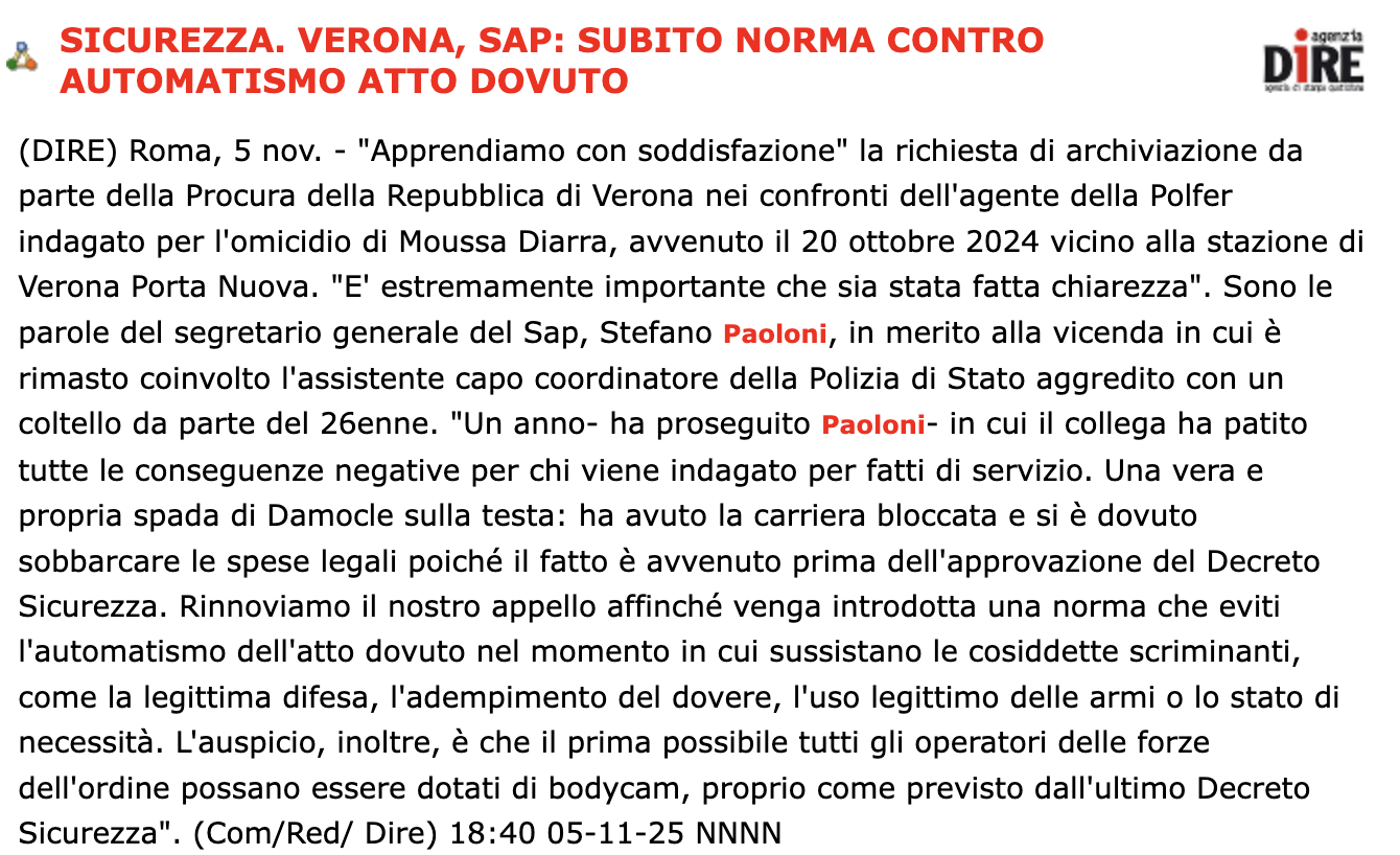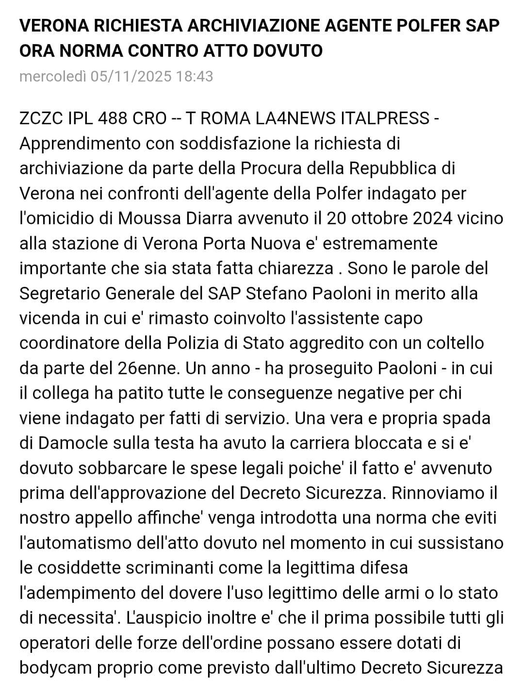 “Apprendimento con soddisfazione” la richiesta di archiviazione da parte della Procura della Repubblica di Verona nei confronti dell’agente della Polfer indagato per l’omicidio di Moussa Diarra, avvenuto il 20 ottobre 2024 vicino alla stazione di Verona Porta Nuova, “è estremamente importante che sia stata fatta chiarezza”. Sono le parole del Segretario Generale del SAP, Stefano Paoloni, in merito alla vicenda in cui è rimasto coinvolto l’assistente capo coordinatore della Polizia di Stato aggredito con un coltello da parte del 26enne.