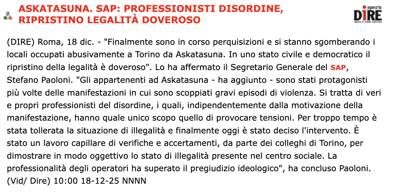 “In uno stato civile e democratico il ripristino della legalità è doveroso“. Lo ha affermato il Segretario Generale del SAP, Stefano Paoloni, commentando le perquisizioni e lo sgombero dei locali occupati abusivamente a Torino da Askatasuna. “Gli appartenenti ad Askatasuna – ha aggiunto – sono stati protagonisti più volte delle manifestazioni in cui sono scoppiati gravi episodi di violenza. Si tratta di veri e propri professionisti del disordine, i quali, indipendentemente dalla motivazione della manifestazione, hanno quale unico scopo quello di provocare tensioni. Per troppo tempo è stata tollerata la situazione di illegalità e finalmente oggi è stato deciso l’intervento. È stato un lavoro capillare di verifiche e accertamenti, da parte dei colleghi di Torino, per dimostrare in modo oggettivo lo stato di illegalità presente nel centro sociale. La professionalità degli operatori ha superato il pregiudizio ideologico”, ha concluso Paoloni.