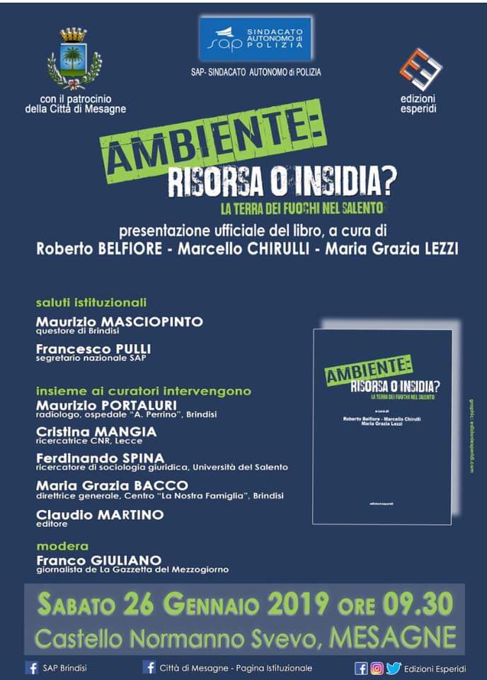Presentato ieri, presso il Castello Normanno Svevo di Mesagne, il volume dal titolo “Ambiente: risorsa o insidia? La Terra dei fuochi nel Salento”, a cura di Roberto Belfiore, Marcello Chirulli, Maria Grazia Lezzi, edito da Edizioni Esperidi. Il saluto: il Sindaco di Mesagne Pompeo Molfetta, il Questore di Brindisi Maurizio Masciopinto, il segretario nazionale SAP (sindacato autonomo di Polizia) Francesco Pulli.