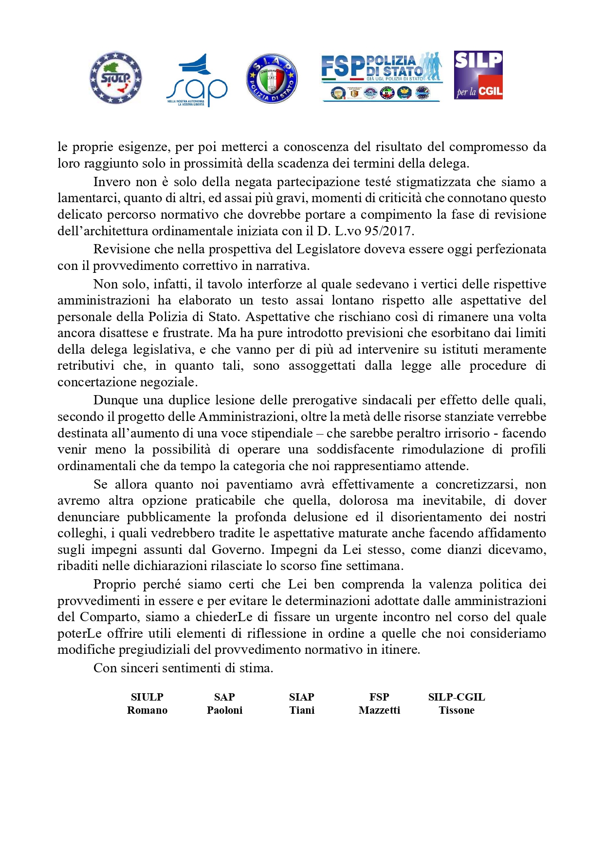 RIORDINO DELLE CARRIERE: LETTERA AL PRESIDENTE DEL CONSIGLIO GIUSEPPE CONTE