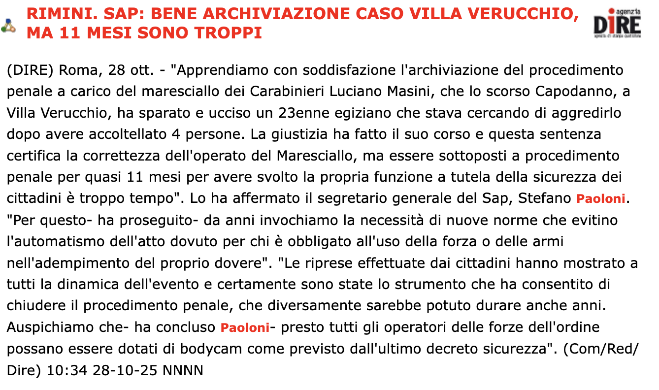 Da parte sua, anche il Segretario Provinciale del SAP di Rimini, Salvatore Giglia, ha espresso soddisfazione per la decisione della Procura di Rimini di archiviare il procedimento. “L’inchiesta ha riconosciuto che il collega ha agito senza alcuna possibilità di scelta, in una situazione di pericolo reale e immediato per sé e per le molte persone presenti. Una conclusione giusta, che conferma come l’intervento fosse pienamente legittimo”, ha spiegato, sottolineando però che: “Da una parte siamo sicuramente contenti che la vicenda si sia chiusa positivamente per il maresciallo Masini ma non possiamo ignorare che per arrivare a questo risultato ci siano voluti dieci mesi. Dieci mesi in cui un servitore dello Stato, che ha legittimamente agito per proteggere sé stesso e gli altri, ha vissuto con una ‘spada di Damocle’ sulla testa. Dieci mesi di incertezza, di sospetto vissuti con angoscia. Tutto questo non può e non deve essere considerato normale”.