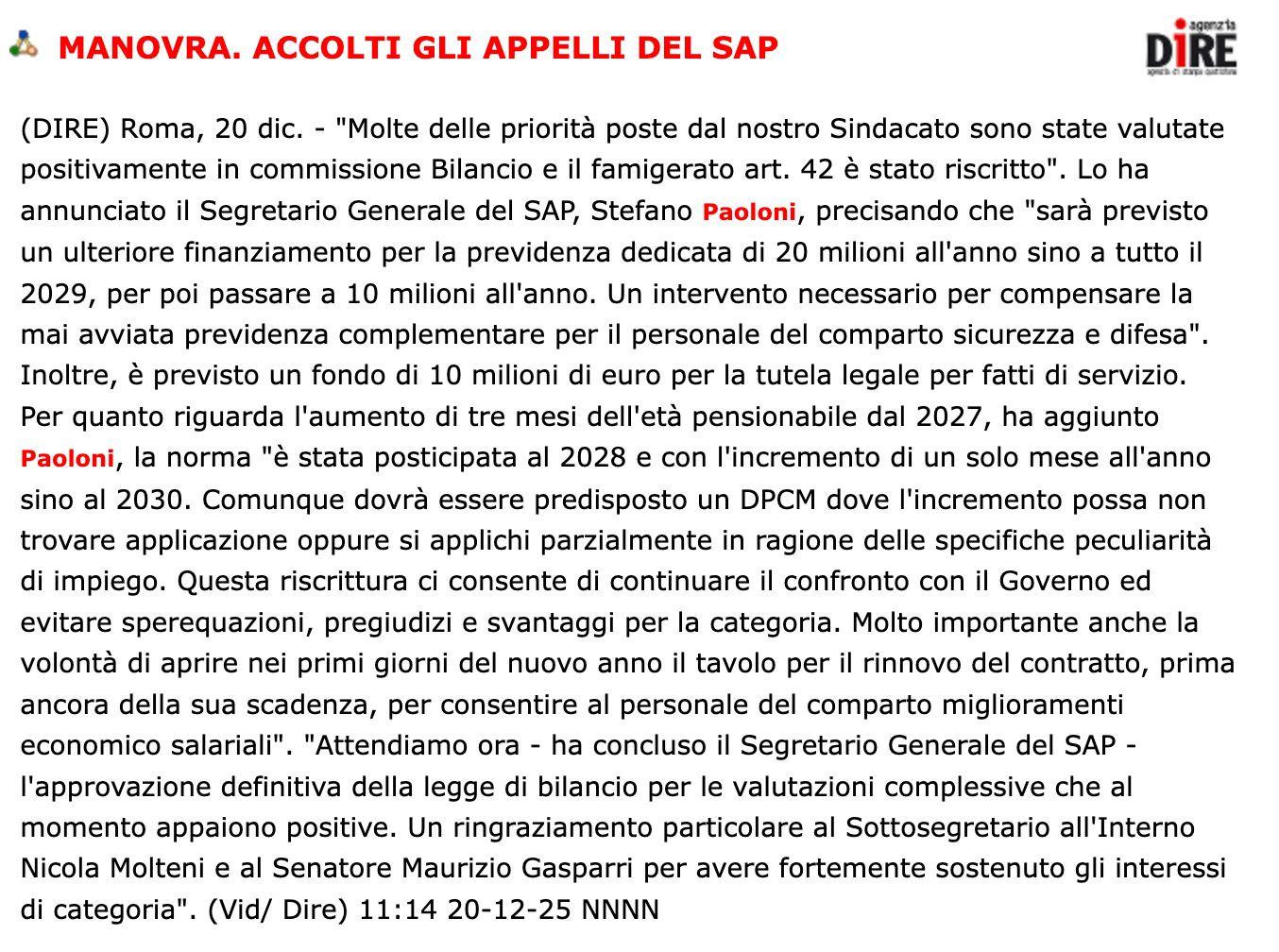 “Molte delle priorità poste dal nostro Sindacato sono state valutate positivamente in commissione Bilancio e il famigerato art. 42 è stato riscritto”. Ad affermarlo è stato il Segretario Generale del SAP, Stefano Paoloni. “Sarà previsto – ha precisato – un ulteriore finanziamento per la previdenza dedicata di 20 milioni all’anno sino a tutto il 2029, per poi passare a 10 milioni all’anno. Un intervento necessario per compensare la mai avviata previdenza complementare per il personale del comparto sicurezza e difesa”.