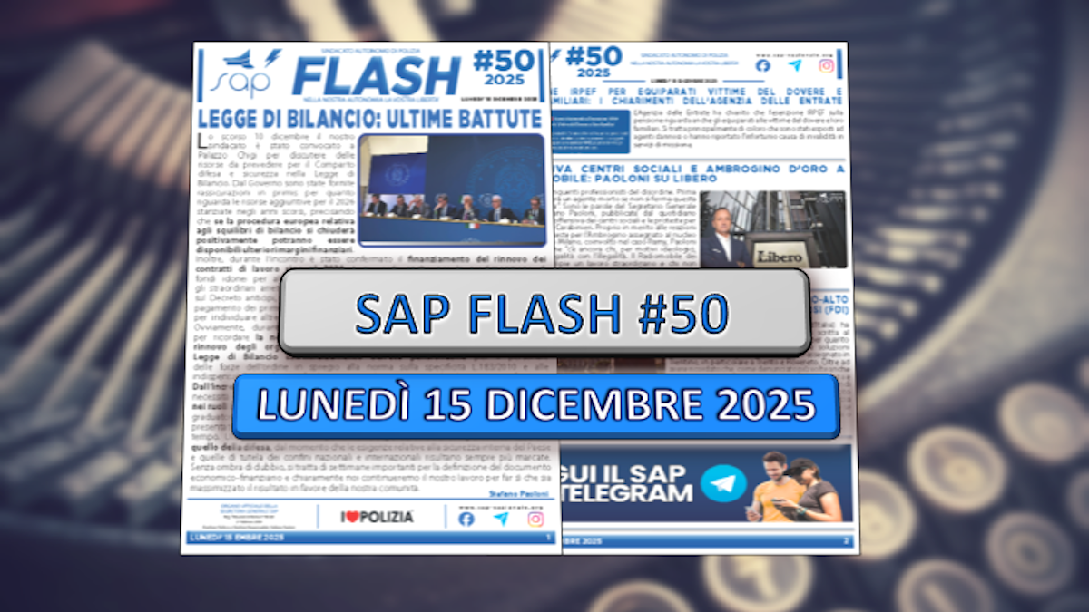 SAP FLASH NR. 50-2025 – LEGGE DI BILANCIO: ULTIME BATTUTE News 12 Dicembre 2025 Fabrizio Pinzaglia 390 views 9 secs 0 Comments È online il SAP FLASH nr. 50 -2025 – LEGGE DI BILANCIO: ULTIME BATTUTEPer scaricarlo clicca sul link sottostante SAP FLASH #50 PREVIOUS CONSIGLIO RICOMPENSE PER MERITI STRAORDINARI E SPECIALI DEL 12 DICEMBRE 2025: ESITI AREA RISERVATA