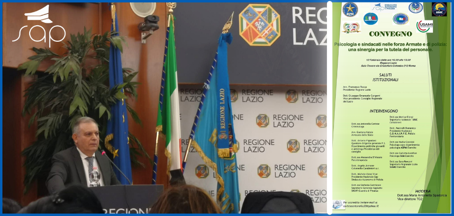 Si è svolto mercoledì 12 febbraio, presso la Sala Tevere della Regione Lazio, un interessante convegno ‘Psicologia e sindacati nelle Forze armate e di Polizia: una sinergia per la tutela del personale’ volto ad approfondire il ruolo della psicologia e delle organizzazioni sindacali nella salvaguardia del benessere del personale in divisa.
