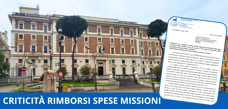 Con riferimento alla circolare prot. 018.1600/15759 del 27 febbraio 2025, emessa dalla Direzione Centrale per i Servizi di Ragioneria, che introduce una modifica normativa sull’imponibilità fiscale dei rimborsi spese per missioni e trasferte dei dipendenti pubblici, abbiamo scritto al Dipartimento per esprimere alcune perplessità che stanno suscitando preoccupazione tra i colleghi interessati.