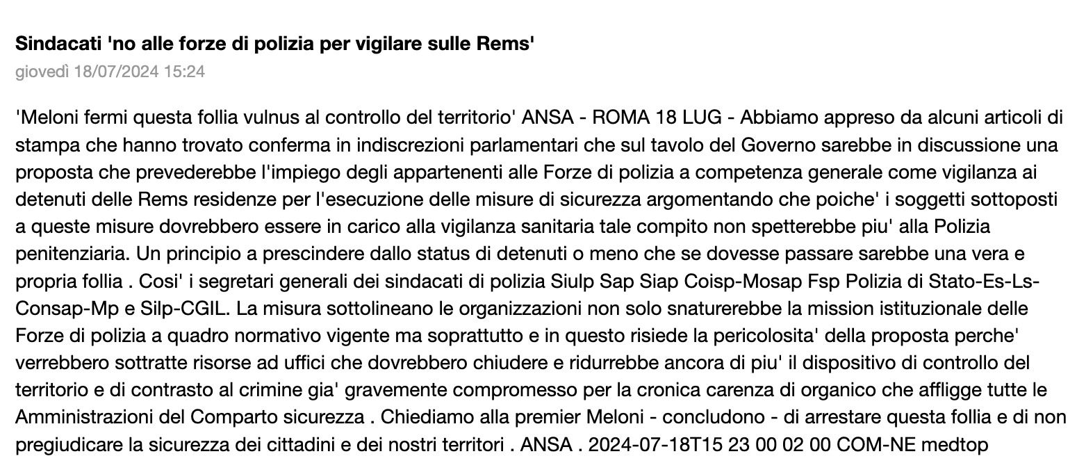 NO A FORZE DI POLIZIA PER VIGILARE DETENUTI DELLE REMS: L’APPELLO DEI SINDACATI News 18 Luglio 2024 Fabrizio Pinzaglia 1.338 views 2 secs 0 Comments IL COMUNICATO ANSA PREVIOUS DECRETO SERVIZI CPR IN ALBANIA. ESITO DELLA RIUNIONE AL DIPARTIMENTO NEXT CARENZA ORGANICO POLIZIA POSTALE, MELONI (SAP FORLÌ-CESENA): LA SITUAZIONE È DRAMMATICA